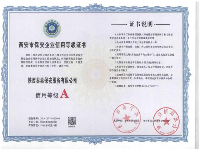 本次信用等级评定覆盖资质许可、财务管理、制度建设、经营业绩、科技创新等十个关键维度,是对企业开展的全方位、多层次严格评估。秦泰保安能够获此殊荣,正是其在各方面均表现出色的有力证明。